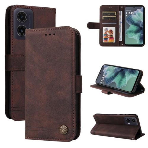 Funda de Cuero para Motorola Moto G35 con Botones de Metal y Diseño Árbol de la Vida (Marrón)