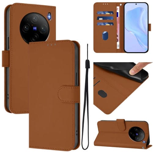 Funda de Cuero con Cordón para Teléfono con Diseño de Piel de Color Liso y Tacto Suave para Vivo X100S 5G (Marrón)