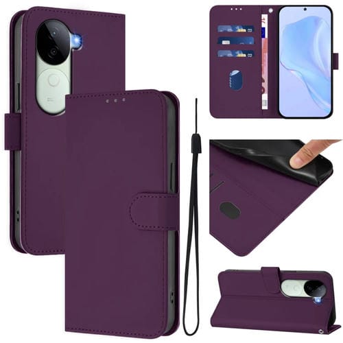 Funda de Cuero con Cordón para Teléfono Vivo V40E 5G India / Iqoo Z9S 5G con Tacto de Piel de Color Sólido (Violeta)