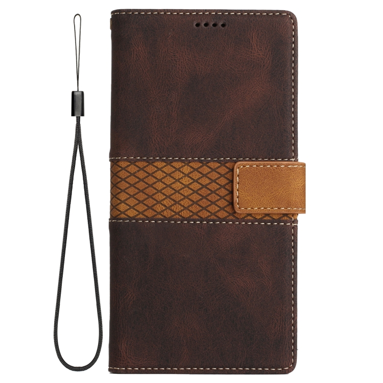 Funda de Cuero para iPhone 15 Plus con Costuras de Cuadrícula y Cordón (Marrón)