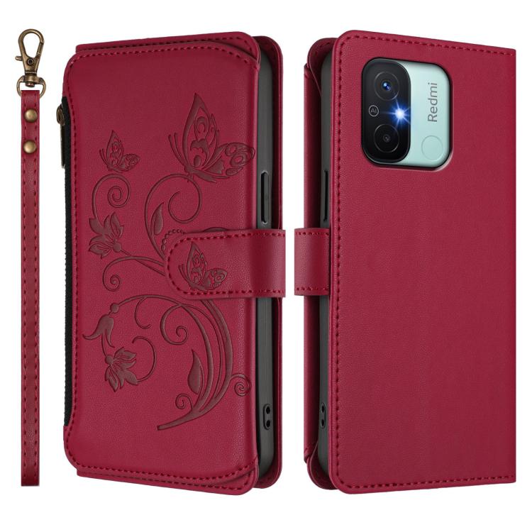 Funda de cuero con cremallera para Redmi 11A / Xiaomi Poco C55, diseño de mariposas, flores y amor, con múltiples tarjetas (rojo vino)
