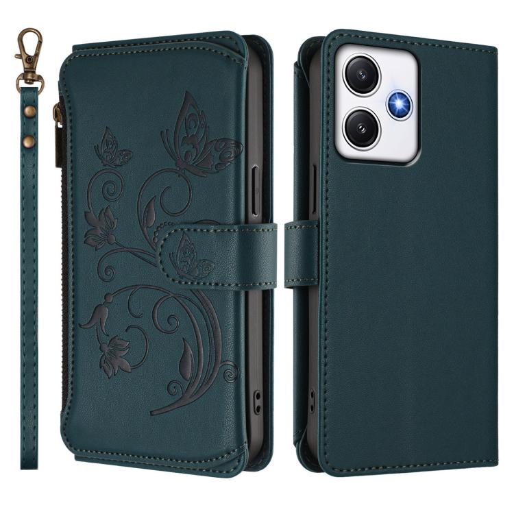 Funda de cuero con cremallera para Redmi 12 4G / 5G / Note 12R, diseño de mariposas y flores, con múltiples tarjetas (verde oscuro)