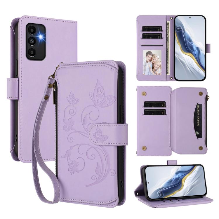 Funda de cuero con cremallera para Samsung Galaxy A13 4G / 5G / A04 4G, diseño de mariposas y flores, con múltiples tarjetas (morado claro)