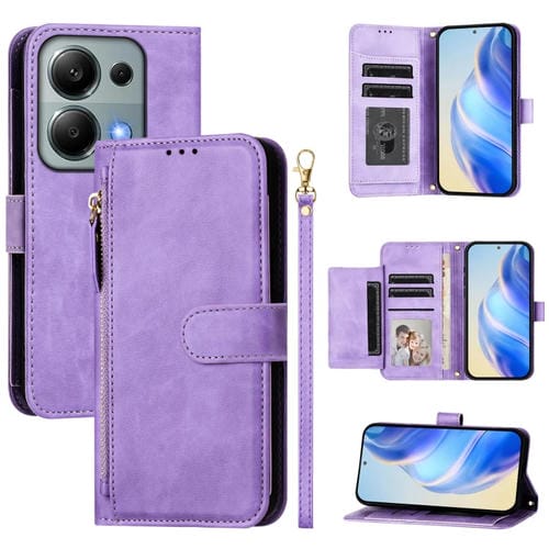 Funda de Cuero con Cremallera y Ranuras para Múltiples Tarjetas para Redmi Note 13 Pro 4G (Morado)