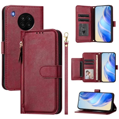 Funda de Cuero con Cremallera y Ranuras para Tarjetas para Honor 50 Lite (Rojo Oscuro)