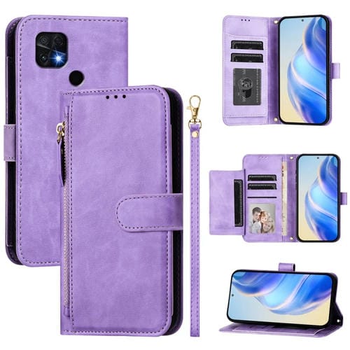Funda de Cuero con Cremallera y Ranuras para Varias Tarjetas para Xiaomi Poco C40/Redmi 10C (Morado)