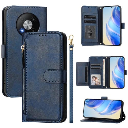 Funda de Cuero con Cremallera y Ranuras para Tarjetas para ZTE Blade A73 5G (Azul)