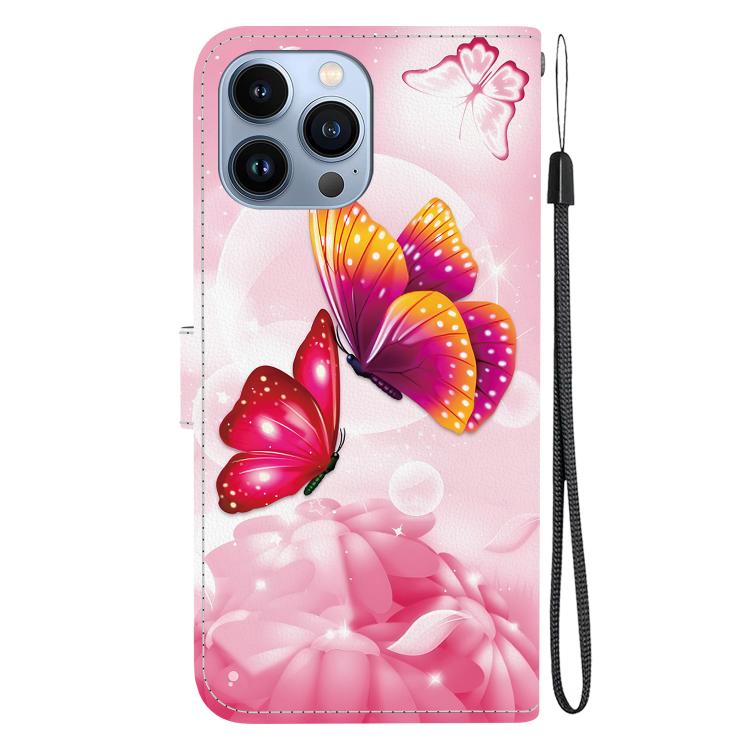 Funda de Cuero para iPhone 13 Pro Max con Dibujo de Colores y Textura de Cristal (Mariposas Rosas)