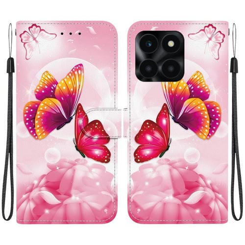 Funda de Cuero para Honor X6A con Dibujo de Mariposas Rosas y Textura de Cristal