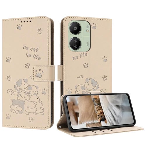 Funda de Piel con Diseño de Gatito En Relieve y Cordón para Redmi 13C 4G/5G/13R (Beige)