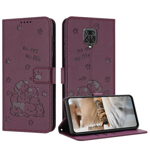 Funda de Piel con Diseño de Gatito En Relieve para Redmi Note 10 Lite con Cordón (Rojo Vino)