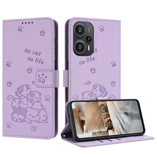 Funda de Piel con Diseño de Gatito En Relieve y Cordón para Redmi Note 12 Turbo (Morado)