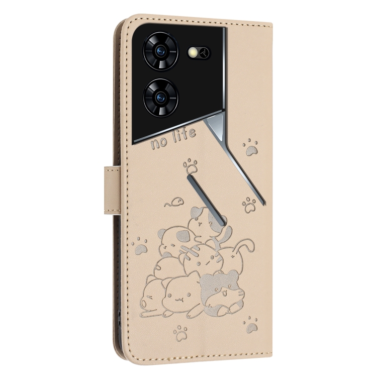 Funda de Cuero para Tecno Pova 5 Pro con Diseño de Gatito En Relieve y Cordón (Beige)