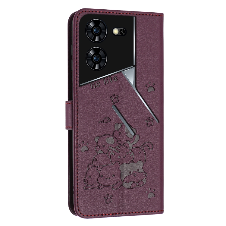 Funda de Cuero para Tecno Pova 5 Pro con Diseño de Gatito y Cordón (Rojo Vino)