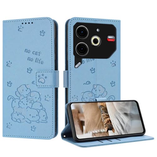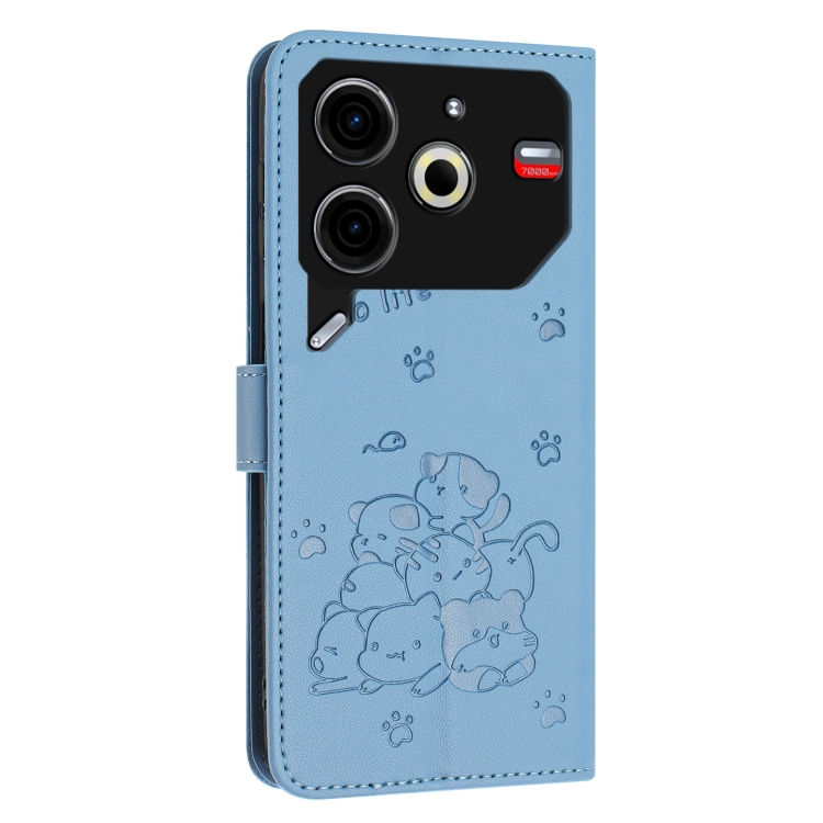 Funda de Cuero para Tecno Pova 6 Neo con Diseño de Gatito En Relieve y Cordón (Azul)