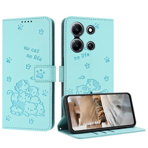 Funda de Cuero Infinix Note 30I con Diseño de Gatito en Relieve y Cordón (Verde Menta)