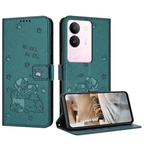 Funda de Piel con Diseño de Gatito En Relieve y Cordón para Vivo S17/S17 Pro/S17T (Verde Oscuro)
