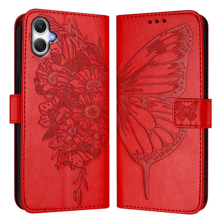 Funda de Cuero Samsung Galaxy A06 4G/5G Diseño Mariposa En Relieve (Rojo)