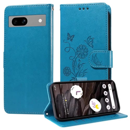 Funda de Cuero con Diseño Mariposas y Flores en Relieve para Google Pixel 7A (Azul)
