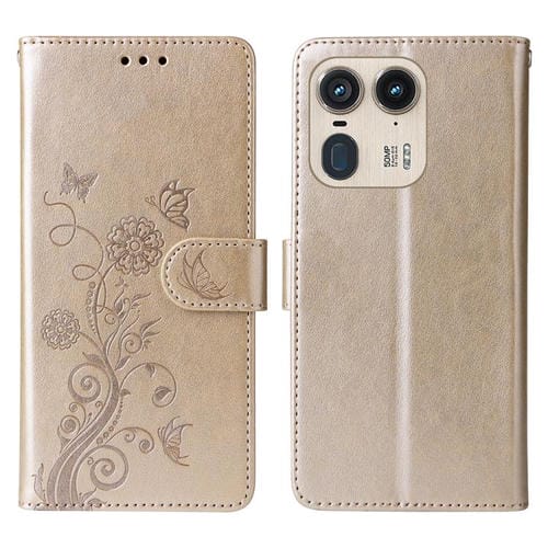 Funda de Cuero Motorola Edge 50 Ultra X50 Ultra con Diseño de Mariposas y Flores en Relieve (Dorada)