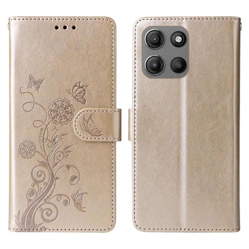 Funda de Cuero Motorola Moto G15/G15 Power con Diseño de Mariposas y Flores en Relieve (Dorada)