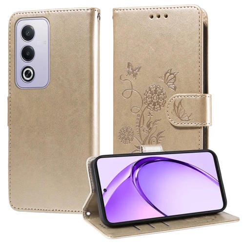 Funda de Cuero con Diseño de Mariposas y Flores En Relieve para Oppo A3 Pro 5G Global/India (Dorada)
