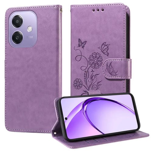 Funda de Cuero con Diseño de Mariposas y Flores En Relieve para Oppo A3X 4G/A3X 5G (Morado)