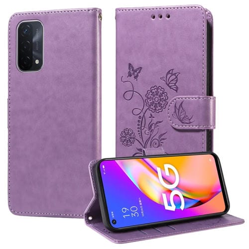 Funda de Cuero con Diseño de Mariposas y Flores En Relieve para Oppo A74 5G/A54 5G (Morado)