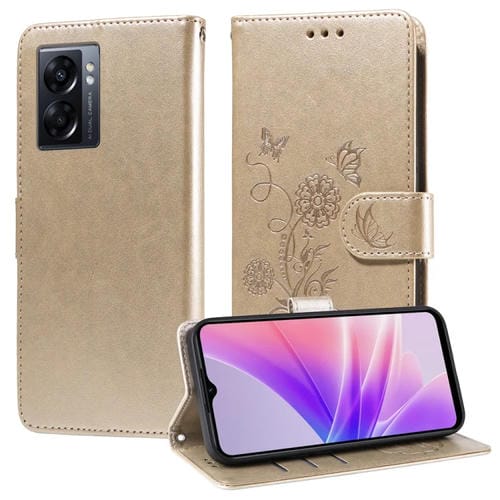 Funda de Cuero con Diseño de Mariposas y Flores En Relieve para Oppo A77 4G/5G/A77S 4G (Dorada)
