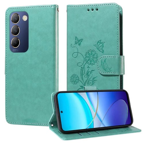Funda de Cuero con Diseño de Mariposas y Flores En Relieve para Vivo Y100 Idn / Y200E 5G (Verde)