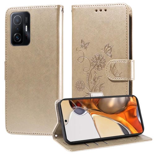 Funda de Cuero con Diseño de Mariposas y Flores En Relieve para Xiaomi Mi 11T/11T Pro (Dorada)