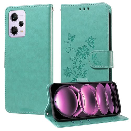 Funda de Cuero con Diseño de Mariposas y Flores En Relieve para Xiaomi Poco X5 Pro 5G (Verde)