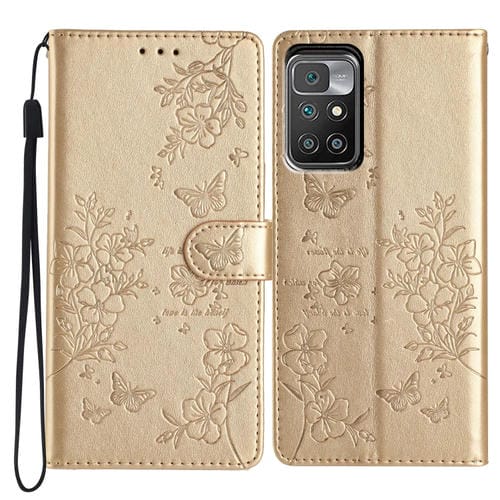 Funda de Cuero con Diseño de Mariposas y Flores para Redmi 10 (Dorada)