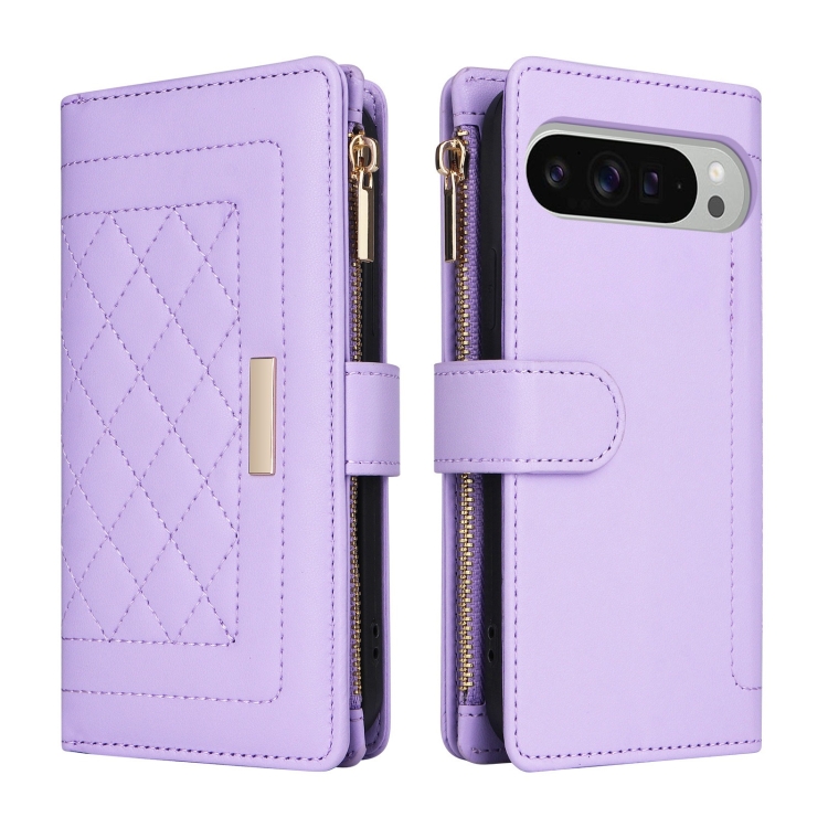 Funda de Cuero con Diseño de Rombos y Billetera Cruzada con Cremallera para Google Pixel 9 Pro XL (Morado)