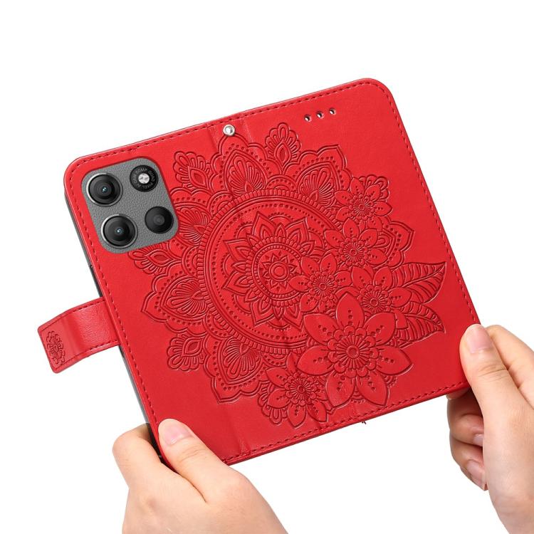 Funda de Cuero para Motorola Moto G15 y G15 Power con Estampado de Flores de Siete Pétalos (Rojo)