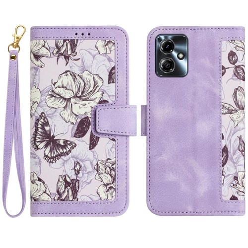 Funda de Cuero con Estampado Floral y Cordón para Motorola Moto G14 (Morado Claro)