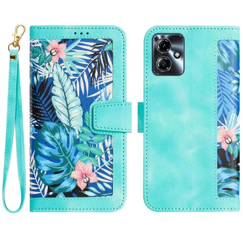 Funda de Cuero para Motorola Moto G14 con Estampado Floral y Cordón (Verde)