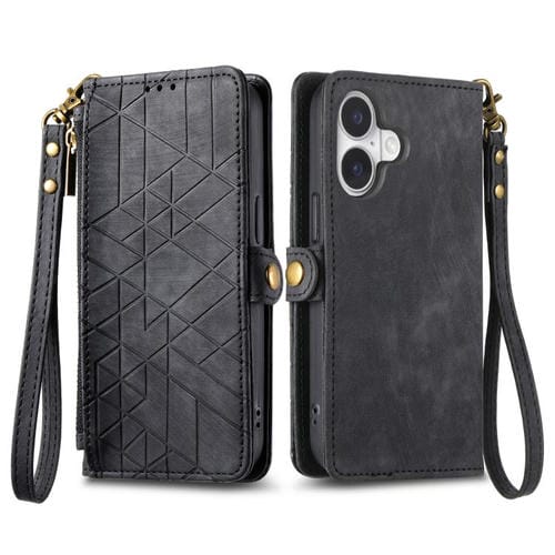 Funda de cuero con hebilla lateral y cremallera geométrica para iPhone 17 (negra)