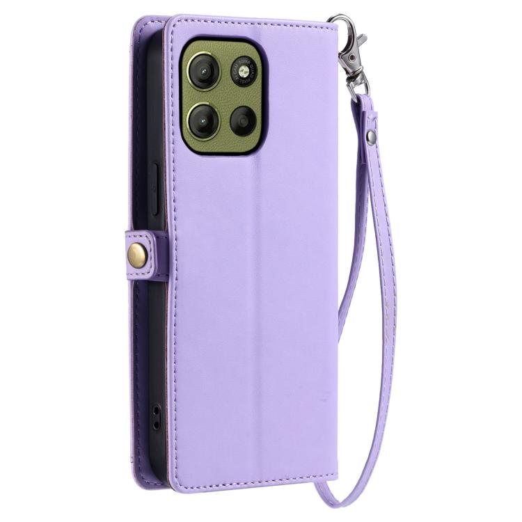 Funda de Cuero para Motorola Moto G15 con Ranura para Tarjetas y Cordón (Morado)