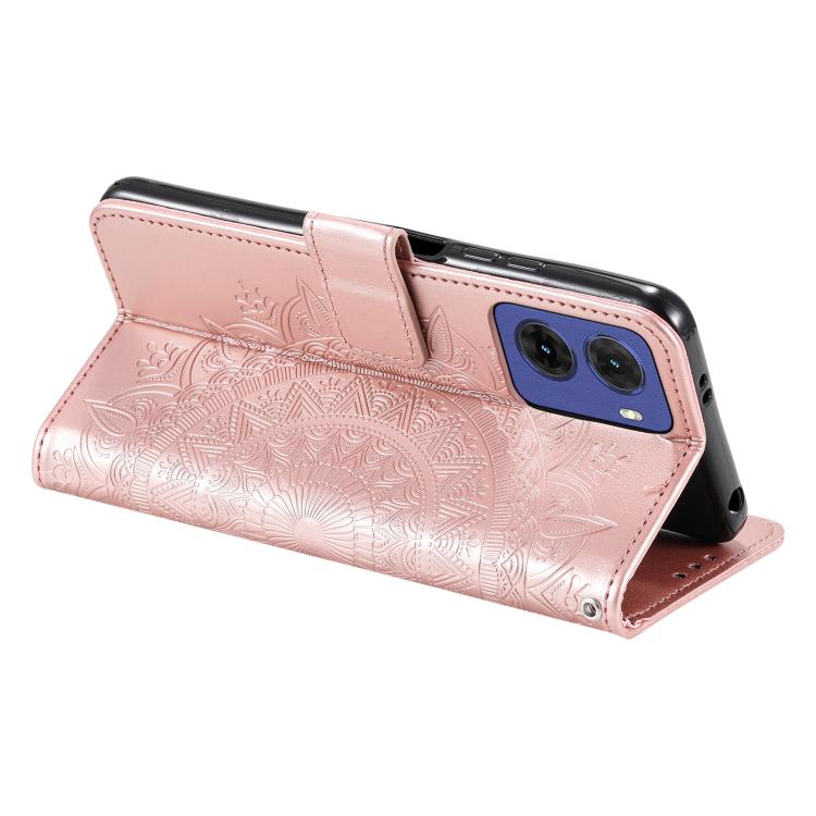 Funda de Cuero con Relieve Flor de Tótem para Motorola Moto G05 con Cordón (Oro Rosa)