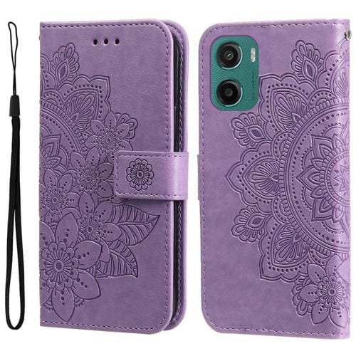 Funda de Cuero con Relieve Flores Siete Pétalos para Motorola Moto G05/E15 (Morado Claro)