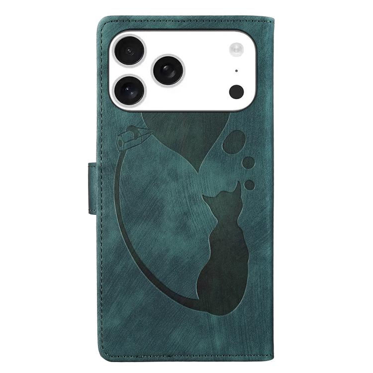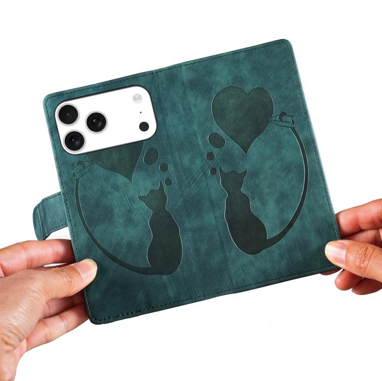 Funda de cuero con relieve de gato y corazón para iPhone 17 Pro Max (verde)