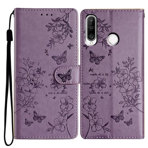 Funda de Cuero con Relieve Mariposa y Flor para Huawei P30 Lite (Morado)
