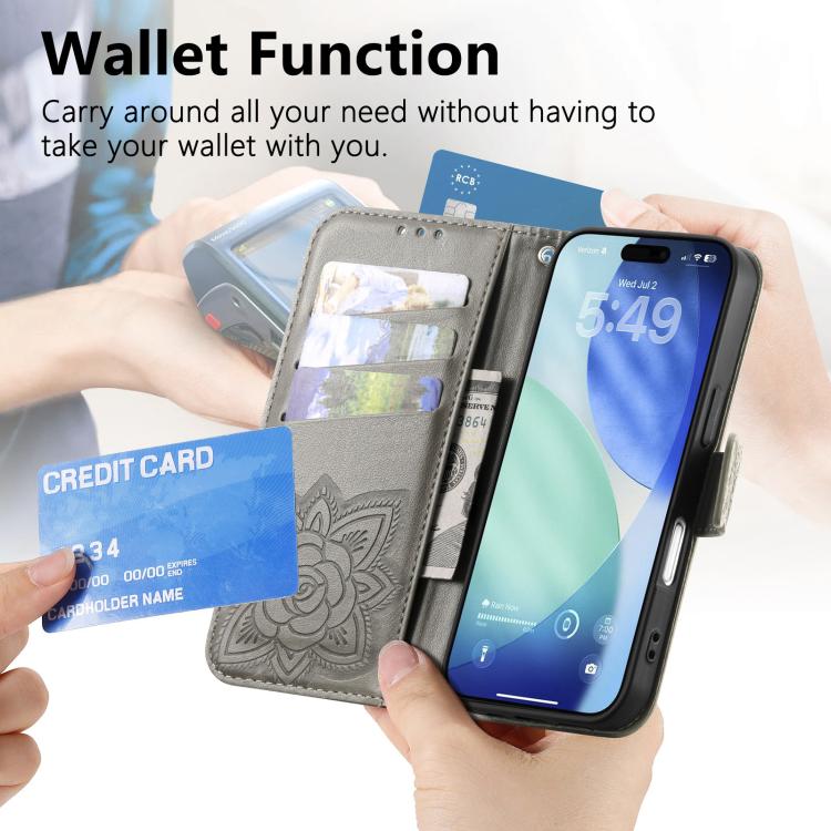 Funda de cuero con relieve de mariposa y flor para iPhone 17 Pro (gris)