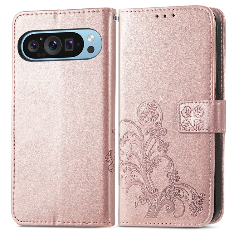Funda de Cuero con Relieve y Cierre de Cuatro Hojas para Google Pixel 9 (Oro Rosa)