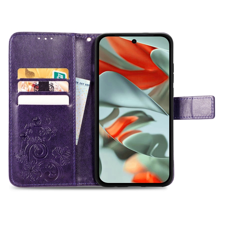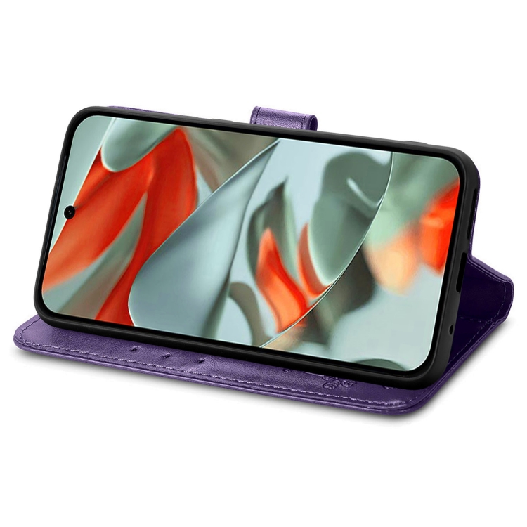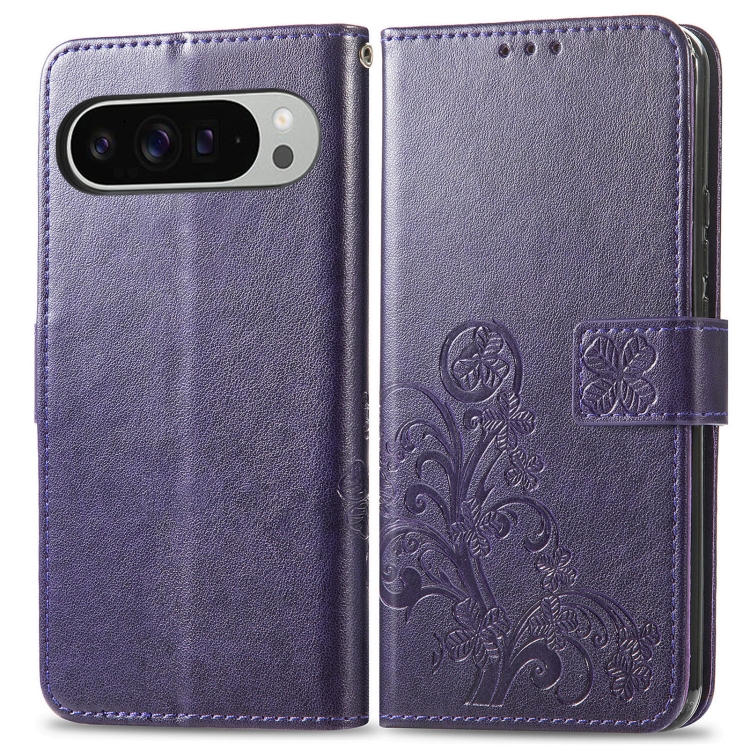 Funda de Cuero con Relieve y Cierre de Cuatro Hojas para Google Pixel 9 Pro XL (Morado)