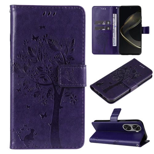 Funda de Cuero con Tapa para Huawei Nova 12 Se y Nova 11 Se con Diseño Árbol y Gato (Morado)