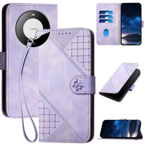 - 1x Funda de Cuero con Tapa y Cordón para Huawei Mate 60 Yx0080 con Diseño de Mariposa y Cuadrícula (Morado Claro)