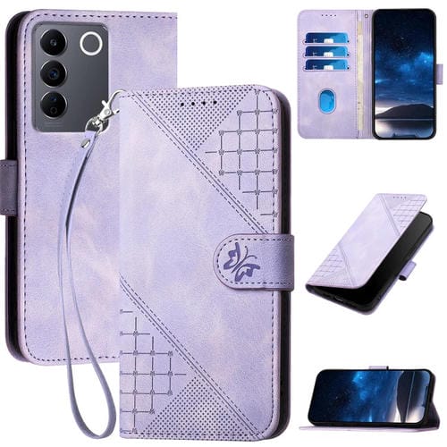 Funda de Cuero con Tapa y Cordón para Vivo V27 5G Global Yx0080 con Diseño En Relieve de Mariposa y Cuadrícula (Morado Claro)