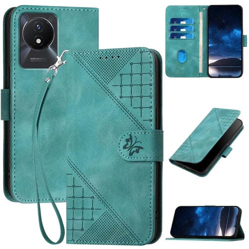 Funda de Cuero con Tapa y Cordón para Vivo Y11 2023 / Y02T Yx0080 con Diseño En Relieve de Mariposa y Cuadrícula (Azul Claro)